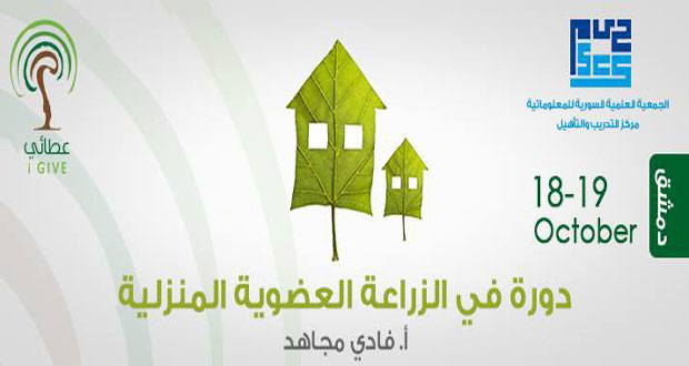 تقيم مبادرة “عطائي” بالتعاون مع الجمعية السورية للمعلوماتية دورة تدريبية في مجال الزراعة العضوية المنزلية يومي السبت والأحد من الأسبوع القادم بهدف تقديم التوعية الأسرية بالفوائد الصحية للزراعة وتنمية قدرات أفراد المجتمع وتغيير سلوكهم للحصول على إنتاج زراعي عضوي بدون إدخال المركبات الكيماوية الصناعية.