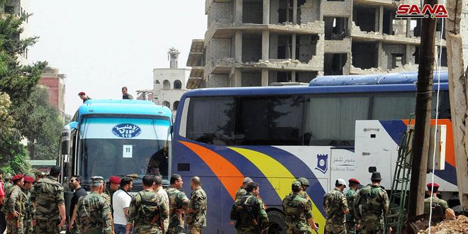 ولفت المراسل إلى أن عملية إخراج الإرهابيين وعائلاتهم مستمرة حتى الانتهاء من نقل جميع الإرهابيين الرافضين للتسوية لتبدأ بعدها عملية تسوية أوضاع الراغبين بالبقاء بعد تسليم أسلحتهم ومن ثم عودة مؤسسات الدولة إلى البلدات وتقديم الخدمات للمواطنين بعد إخراج الإرهابيين منها.