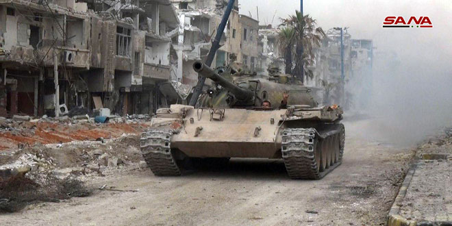 واصلت وحدات من الجيش العربي السوري عملياتها العسكرية ضد ما تبقى من بؤر المجموعات الإرهابية في حي الحجر الأسود بالتزامن مع تكثيف سلاحي المدفعية والجو ضرباتهما الدقيقة على تحصيناتهم وسط حالة من التخبط والفرار بين أفرادها.