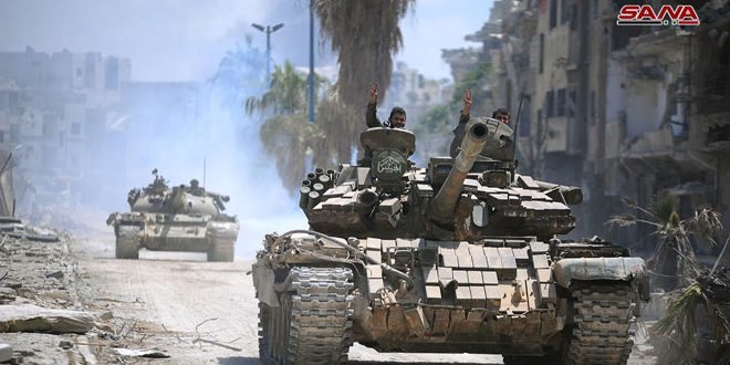 وأفاد مراسل سانا الحربي من حي الحجر الأسود بأن وحدات من الجيش تقدمت اليوم من النقاط التي سيطرت عليها أمس بعد أن أمنتها باتجاه بؤر الإرهابيين في شارع دير ياسين على أطراف الحي من الجهة الشمالية وأحكمت خلالها سيطرتها على بعض الأبنية السكنية.