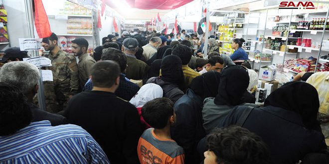 حشد لافت شهده اليوم الثاني من مهرجان “الخير بغوطتنا2” في مدينة دوما توافدوا من مختلف الأعمار لما يقدمه من منتجات تلبي احتياجاتهم بعد سنوات صعبة قضوها تحت سيطرة التنظيمات الإرهابية التي حرمتهم من أبسط حاجياتهم وتاجرت بلقمة عيشهم.