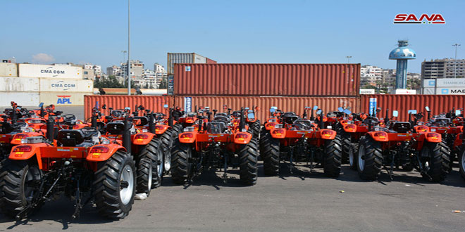 وصل إلى مرفأ اللاذقية اليوم 100 جرار زراعي استطاعة الجرار 70 حصانا مستوردة من الصين وسيتم توزيعها على مجالس المدن في المحافظات.