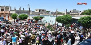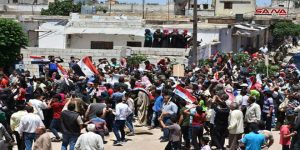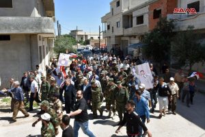 وذكر مراسل سانا الحربي في حماة أن المئات من الأهالي احتشدوا على مداخل البلدتين الواقعتين في الريف الجنوبي لاستقبال وحدات قوى الأمن الداخلي رافعين الأعلام الوطنية وصور السيد الرئيس بشار الأسد.