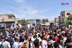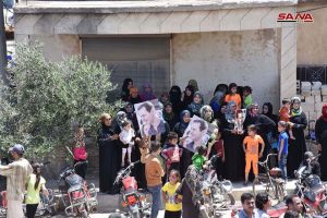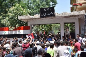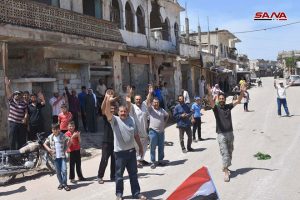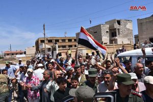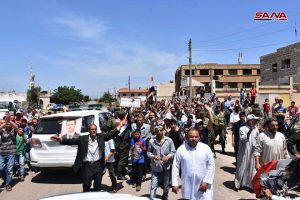 الأهالي استقبلوا اليوم وحدات قوى الأمن الداخلي بترحيب وأهازيج وأغان وطنية رافعين الأعلام الوطنية وصور السيد الرئيس بشار الأسد يحدوهم الأمل بمستقبل يبنيه أبناؤهم الذين أعاد إلى وجوههم الجيش العربي السوري الإبتسامة من جديد بعد البطولات التي أفضت إلى إخراج الإرهابيين أذلاء من قراهم إلى غير رجعة.