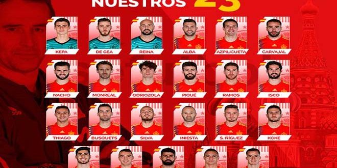 كشف المدير الفني لمنتخب إسبانيا جولين لوبيتيجي اليوم الاثنين تشكيلته التي ضمت 23 لاعبا للمشاركة في نهائيات كأس العالم 2018 لكرة القدم التي تستضيفها روسيا هذا الصيف.