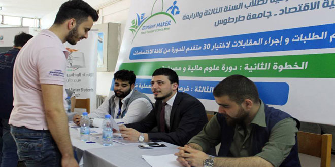 ثلاثون شاباً وشابة من طلاب كلية الاقتصاد في جامعة طرطوس استهدفهم مشروع عامل البنك الذي تقيمه الغرفة الفتية الدولية بالتعاون مع بنك البركة وكلية الاقتصاد وفرع الاتحاد الوطني لطلبة طرطوس وتتضمن أنشطته تعريف المشاركين بفرص العمل المتاحة لهم في مجالات العمل البنكي بالاضافة إلى اطلاعهم على أبرز متطلبات سوق العمل.