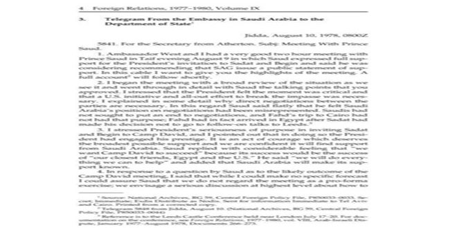 كشفت وثائق نشرتها وزارة الخارجية الاميركية عن دعم النظام السعودي لمفاوضات كامب ديفيد بين كيان الاحتلال الاسرائيلي ومصر في سبعينيات القرن الماضي على الرغم من الموقف المعلن في حينه لهذا النظام والذي عارض هذه المفاوضات.