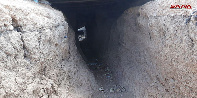 وعثرت الجهات المختصة بالتعاون مع الأهالي ولجان المصالحة الأربعاء الماضي على شبكة أنفاق وخنادق مقبية طول بعضها نحو 700 متر وارتفاع مترين وعرض متر حفرها الإرهابيون تحت الأبنية السكنية والمزارع في بلدة بيت سحم وتمتد باتجاه مدينة جرمانا وطريق المطار وبلدة عقربا إضافة إلى كمية من الذخائر المتنوعة وقذائف الهاون والأسلحة وعشرات العبوات الناسفة من مخلفات التنظيمات الإرهابية.