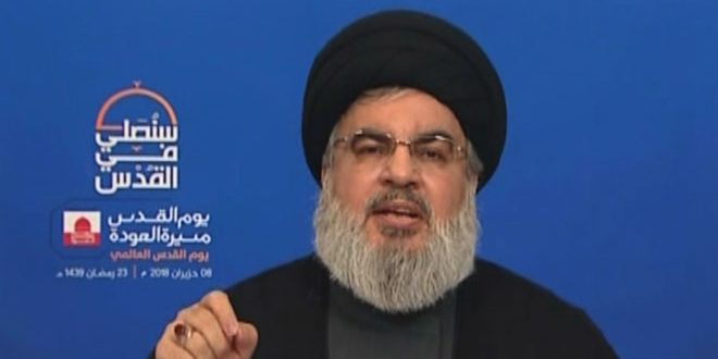 وفي كلمة له اليوم بمناسبة يوم القدس العالمي خاطب السيد نصرالله كيان الاحتلال الإسرائيلي قائلا “اعترفوا أيها الصهاينة أنكم فشلتم في إسقاط عمود المقاومة في المنطقة وأن أحلامكم ورهانكم على الجماعات الإرهابية ذهبت أدراج الرياح” داعيا مشيخات الخليج المتورطة في الحرب الإرهابية على سورية إلى الاعتراف أيضا بهزيمتها.
