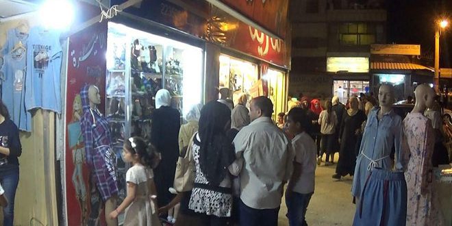 واليوم تزدحم شوارع وأسواق درعا بالمواطنين الذين يتسوقون استعدادا لعيد الفطر وتوفر المحال التجارية ومراكز التسوق كل مستلزمات العيد من ألبسة وحلويات.