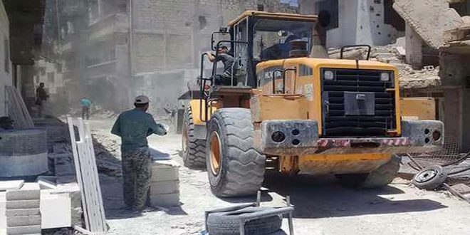 وأوضحت عضو المكتب التنفيذي بالمحافظة المهندسة حمدى العرقاوي في تصريح لمراسل سانا اليوم أن الآليات تعمل على ترحيل الأنقاض وفتح الشوارع تمهيدا لدخول الورشات والمباشرة بتأهيل البنى التحتية التي دمرها الإرهابيون لإعادة الخدمات الأساسية إلى التجمع.