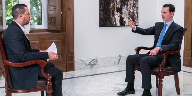 وأشار الرئيس الأسد إلى أنه منذ بداية الحرب وعندما بدأت تأخذ الطابع العسكري بشكل واضح على الجبهة الجنوبية تحديداً كان الإسرائيلي يقصف بشكل مستمر باتجاه القوات السورية وبالتالي هو يدعم الإرهابيين دعما مباشراً، والمدفعية الإسرائيلية والطيران الإسرائيلي يشكلان مدفعية الإرهابيين والقوات الجوية للإرهابيين، مؤكداً أن أول ضرب لـ “إسرائيل” سياسياً وعسكرياً وبكل المجالات هو ضرب إرهابييها داخل سورية.