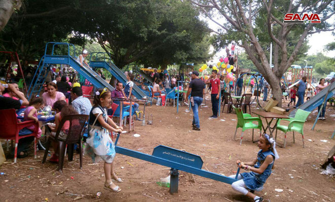 مشاهد فرح الأطفال تزينها ضحكاتهم وثيابهم الجديدة بالرغم من غياب الأب المكلف بمهمة عسكرية في الجيش العربي السوري حيث تقول الطفلة جنى بدور: العيد حلو كتير اشترينا ثيابا جديدة وزرنا اقاربنا لكننا لن نتمكن من الذهاب إلى مكان بعيد لأن أبي غير موجود معنا مشيرة إلى أنه عايدها وأخاها على الهاتف ووعدها بأن يشتري لها الهدايا في أول إجازة يعود فيها الى المنزل.