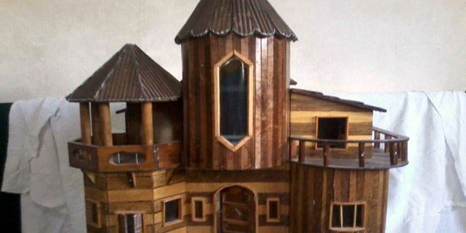 سراي الدين ابن قرية أم رواق بمحافظة السويداء يستخدم في تنفيذ أعماله أدوات بسيطة تتضمن مشرطاً ومنشاراً يدوياً صغيراً مع مواد أولية من خشب وغراء ومسامير واعواد كبريت وأحيانا زجاجا.