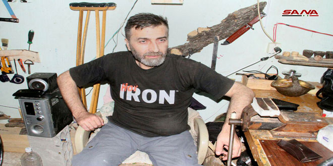 مراسلة سانا زارت المعرض والتقت الجريح الفنان الذي بين أن اختياره لهذه الحرفة نابع من عشقه للخشب كمادة قابلة للتطويع مضيفا إنه بدأ العمل منذ نحو سنتين من خلال المشاركة بلوحة في المركز الثقافي ونالت إعجاب الكثيرين ما شجعه لصقل موهبته.