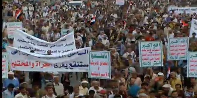ندد المشاركون في مسيرة يمنية حاشدة اليوم بعدوان تحالف النظام السعودي على محافظة الحديدة والتواطؤ الأممي مع قوى العدوان.