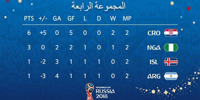 ترتيب المجموعة الرابعة في مونديال روسيا 2018 بعد نهاية الجولة الثانية من المنافسات