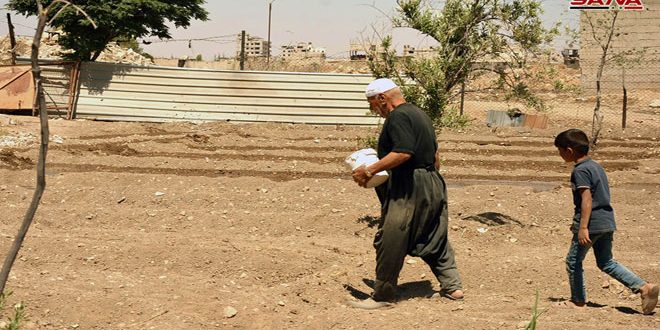 يعاود أبو زاكر نثر ما تبقى من بذور فيما حفيده احمد سبع سنوات يقفز بجسمه النحيل خلفه واحد ابنائه يأخذ مجرفة يسهل جريان الماء لأشباع المساكب.
