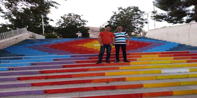 ثلاثة من الفنانين التشكيليين الشباب قاموا مجتمعين بتزيين مدخل حديقة تشرين في دمشق استعدادا لمهرجان الشام بتجمعنا الذي ينطلق الأربعاء القادم ويتضمن فعاليات فنية وثقافية ورياضية.