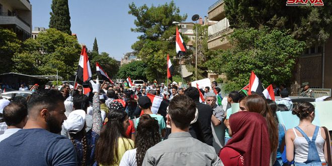 نفذت المنظمات الطلابية والشبابية السورية والفلسطينية والعربية في سورية اليوم وقفة تضامنية أمام مكتب الأمم المتحدة بدمشق للمطالبة بوقف العدوان السعودي الصهيوني الأمريكي على اليمن.