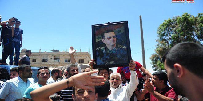 تجمع المئات من أهالي بلدة إبطع وقرية أم ولد بريف درعا ترحيبا بالجيش العربي السوري ودعما له في حربه على التنظيمات الإرهابية التكفيرية.