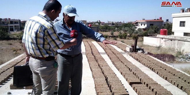 بأدوات بسيطة تمكن صالح مرشد من بلدة الكفر بالسويداء من إنتاج مكعبات للتدفئة المنزلية مصنعة من مواد الكرتون ونشارة الخشب ومخلفات أوراق الشجر.