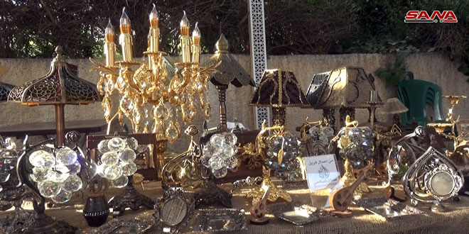 كاميرا سانا زارت المعرض واطلعت على المعروضات التراثية فيه من الموزاييك الخشبي الدمشقي المضاف إليه تنزيل الصدف ومجسمات الرسم على الزجاج وصناعة الفسيفساء من حصى البحر والنحاسيات والفوانيس الدمشقية بسحرها الخاص والثريات الشرقية والمفروشات الشامية وبعض الأدوات المنزلية التراثية ومصابيح الإنارة القديمة التي تعود إلى 120 عاما إضافة إلى المنسوجات والبروكار الدمشقي والمنمنمات اليدوية والإكسسوارات والحدادة.