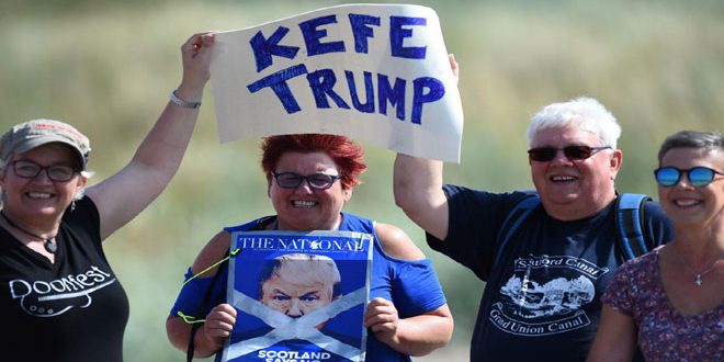 كما احتشد عشرات المتظاهرين أمام منتجع الغولف الاسكتلندي “تيرنبيري” الذي يمتلكه ترامب على الشاطئ الغربي للبلاد ويمضي فيه حاليا عطلة نهاية الأسبوع مع زوجته ميلانيا ورددوا هتافات تصفه بالعنصري والكاذب.