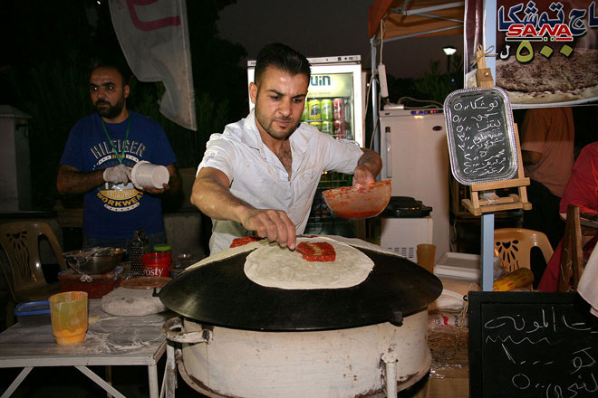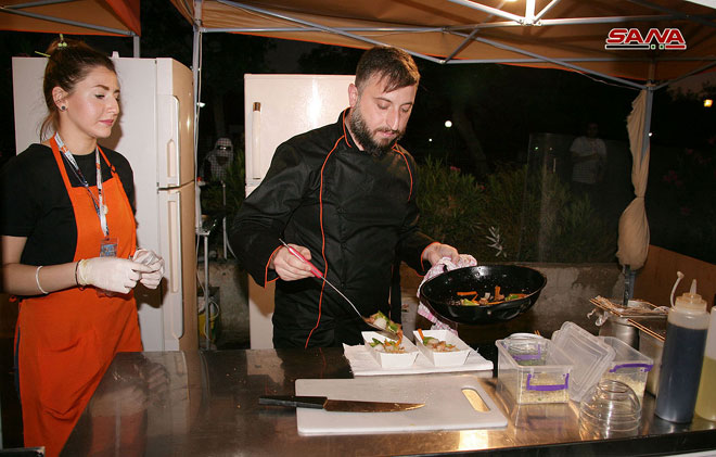 عشاق وهواة ومتخصصون في فن الطبخ يقدمون أشهى الأصناف والأطباق المحلية والعالمية ضمن “شارع الأكل” المقام لأول مرة بمدينة دمشق بهدف التعريف بالمطاعم والمأكولات الجديدة.