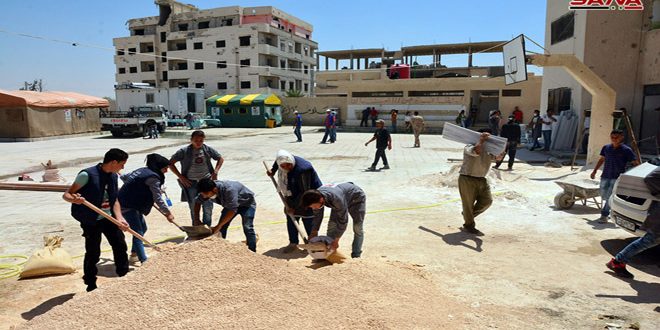 وأوضح عمر العاروب عضو المكتب التنفيذي للاتحاد الوطني لطلبة سورية أنه بعد الانتهاء من تأهيل 6 مدارس في كفر بطنا وسقبا وعين ترما وزملكا وداريا امتدت الحملة إلى بلدة مرج السلطان ويجري العمل حالياً على إعادة تأهيل وترميم مدرسة البلدة إضافة إلى مدخلها وساحتها الرئيسية.