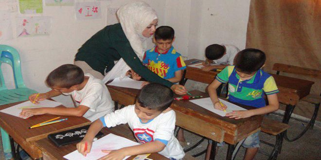 وفي صف الرسم والفنون يدرب الفنان التشكيلي عيسى النهار الأطفال على تنفيذ رسومات مختلفة المواضيع والطريقة الصحيحة لإمساك أقلام التلوين واختيار اللون الأنسب لإنجاز كل جزء من الموضوع المراد رسمه.