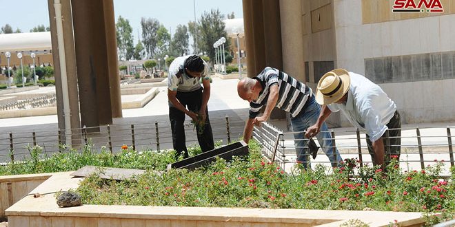 وأوضح منير الحاج علي رئيس قسم الخدمات والزراعة في المدينة لـ سانا أن العناية بالمساحات الخضراء تلقى اهتماماً كبيراً كونها الواجهة البصرية والمظهر الجمالي للمكان على اتساع مساحته مبيناً أن العمل يتضمن تدعيم بعض النباتات والمتابعة الدائمة من سقاية وتعشيب وتجميل بعض المواقع.