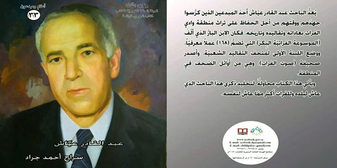 خصصت الهيئة العامة السورية للكتاب ضمن سلسلة أعلام ومبدعون كتابها الشهري لليافعة للباحث عبد القادر عياش الذي كرس جهده ووقته من أجل الحفاظ على تراث منطقة وداي الفرات بعاداته وتقاليده وتاريخه.