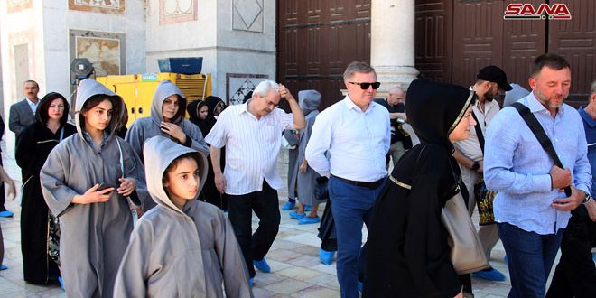 خمس عائلات من ذوي الشهداء الروس الذين بذلوا دماءهم في سورية برفقة خمس من عائلات الشهداء السوريين اجتمعوا معاً في رحاب الجامع الأموي مطلعين على تاريخ سورية وحضارتها وسلامها الذي نشرته في العالم.