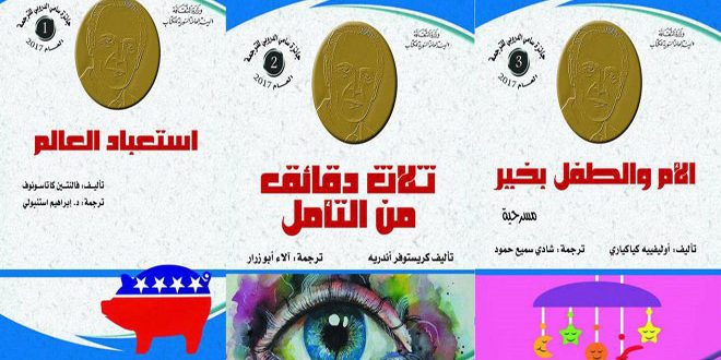 والكتب الثلاثة هي “ثلاث دقائق من التأمل” تأليف كريستوفر أندريه وترجمة آلاء أبو زرار ويقع في 152 صفحة من القطع الكبير ومسرحية “الأم والطفل بخير” تأليف أوليفييه كياكياري وترجمة شادي سميع حمود وتقع في 103 صفحات من القطع الكبير و”استعباد العالم” وهو من تأليف فالنتين كاتاسونوف وترجمة الدكتور إبراهيم استنبولي ويقع في 678 صفحة من القطع الكبير.