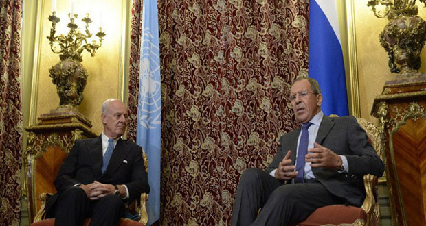 ولفت لافروف إلى أن روسيا رحبت بتعيين دي ميستورا في منصبه وكانت تدعو لاستئناف جهود التسوية السياسية منذ أمد طويل.
