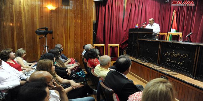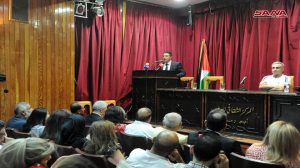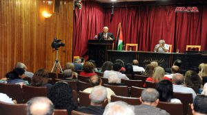 أما الشاعر محمد حديفي الذي ألقى قصيدة بعنوان “أغان لدمشق الشام” فأشار إلى أن سورية قدمت للعرب خيراتها وتلقت جزاء ذلك الخيانة والغدر فقال على قارب البحر البسيط: “أبناء يعرب أهدوا الشام مقصلة.. والشام تهدي إلى زوارها الحبقا.. هذي فلسطين فلتشهد مرابعنا.. كم قد سفحنا الدمع والعرقا”.