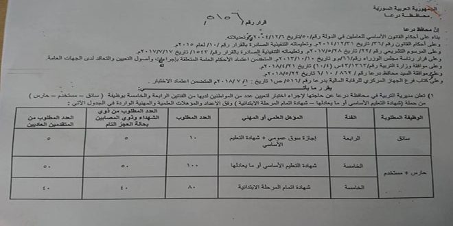 أعلنت مديرية التربية في محافظة درعا عن اختبار لتعيين 190 مواطنا من الفئتين الرابعة والخامسة بوظيفة سائق ومستخدم وحارس.