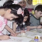 وعلى طاولة تعليم الأطفال الرسم العجمي كانت مجموعة من الاطفال تحاول تطبيق رسومات العجمي بالألوان المائية بحرص وإتقان.