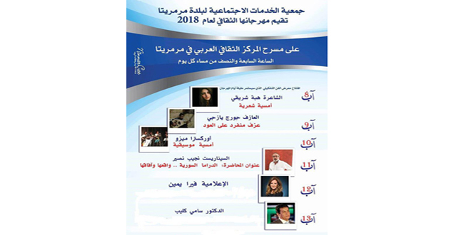 تنطلق غداً فعاليات المهرجان الثقافي لجمعية الخدمات الاجتماعية لبلدة مرمريتا بوادي النضارة بحمص وتستمر لغاية الـ13 من الشهر الحالي وذلك على مسرح المركز الثقافي في مرمريتا.