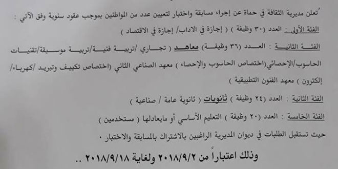 أعلنت مديرية الثقافة بحماة مسابقة واختبارا لتعيين 110 عمال بموجب عقود سنوية من الفئات الاولى والثانية والخامسة.