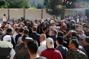 وزير التربية الدكتور هزوان الوز أوضح للوفد أن المدرسة تمثل نموذجا للمدارس التي يتم تجهيزها وإعادة تأهيلها في المناطق التي يحررها الجيش العربي السوري من رجس الإرهاب مبينا أنه تجري الاستعدادات لانطلاق العام الدراسي الجديد واستقبال أعداد أكبر من التلاميذ في المدارس وتأمينهم بالكتب المدرسية ومستلزمات العملية التعليمية.
