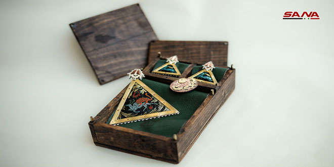 داخل الورشة وثقت كاميرا سانا تراثا يعود إلى أكثر من مئة عام حيث يقوم حسين وفريقه بصياغة الحلي بأسلوب يجمع الحاضر بالماضي حيث يقوم بصياغة الخواتم والأقراط والقلائد المرصعة بتصاميم مميزة لها مدلولها وخصوصيتها لدى زبائنها ويطلق على هذه القلائد الأسماء التي تعبر عنها … كقلادة تانغو الرقصة المشهورة و دريم كاتشر صائدة أو لاقطة الأحلام وهي مصنوعة من الفضة والنحاس الأصفر والأحمر مغلفة بعلبة من خشب الزان المطعمة بالنحاس والجلد وهي عبارة عن شبكة دائرية يتدلى الريش من قسمها السفلي وقلادة همس الصحراء وهي قطعة تعلق على مرآة السيارة صممت من النحاس الأحمر والأصفر والجلد محفوظ بداخلها أبيات شعرية مخطوطة باليد على قماش القطن الخام ومغلفة بعلبة من خشب الزان المطعمة بالنحاس والجلد وهناك أيضا قلادة القباقيب الحلويات التراثية التي انطلقت من الحارات الدمشقية القديمة وتسمى أحيانا بقبقاب غوار قام حسين بتحويل هذه الحلوى إلى حلي مبهجة معاصرة لتكون جزءا من مجموعة صيف 2018.