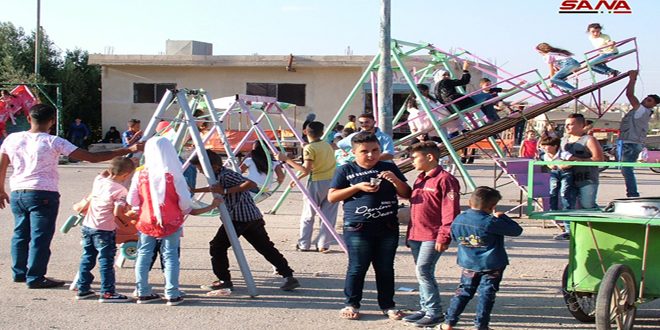أهالي بلدة غصم استقبلوا العيد بفرحة عارمة وسط أجواء من البهجة على وجوه الأطفال الذين حرموا الأمن والاستقرار لمدة تزيد على سبع سنوات بسبب الأعمال الإرهابية.