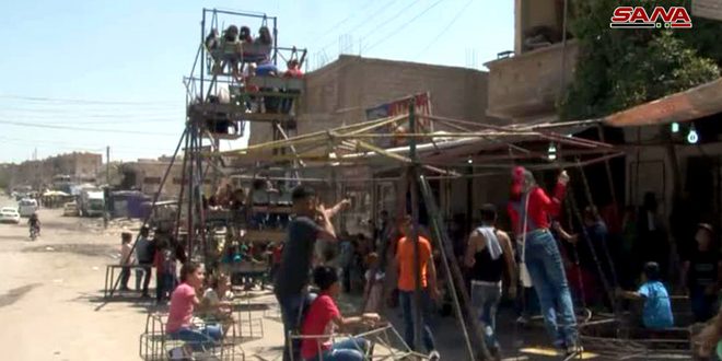 أحمد اليونس الذي نصب مراجيح وألعاباً للأطفال في شارع الوادي أشار إلى أن عمله ينصب في إسعاد الأطفال الذين حرموا من الفرح واللعب بأمان وطمأنينة بسبب الأعمال الإرهابية حيث كانت قذائف الغدر تنهمر عليهم في العيد أما اليوم فهم يلعبون وفي عيونهم فرحة وبهجة تدفعنا جميعاً للدعاء لأبطال الجيش الذين أرسوا بفضل تضحياتهم الأمن والأمان.
