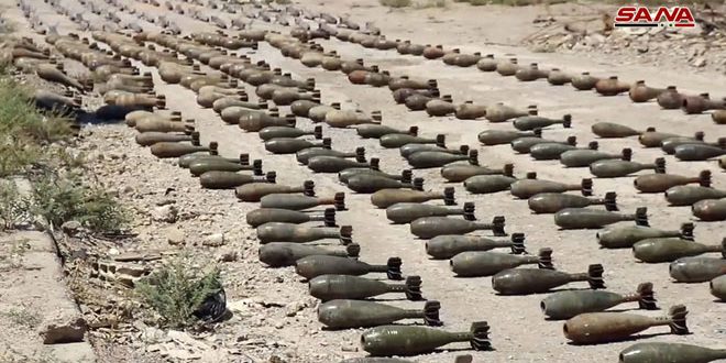 وذكر مراسل سانا أن وحدات الهندسة في الجيش العربي السوري بالتعاون مع الجهات المختصة عثرت خلال عملياتها المتواصلة لتمشيط بلدة صبيخان من مخلفات الإرهابيين على مستودع أسلحة وذخائر يحتوي على بنادق حربية آلية وعدد كبير من قذائف الهاون بعضها غربي الصنع بعيارات مختلفة “60 و120 و160” مم اضافة الى قذائف دبابات وصواريخ محمولة على الكتف.