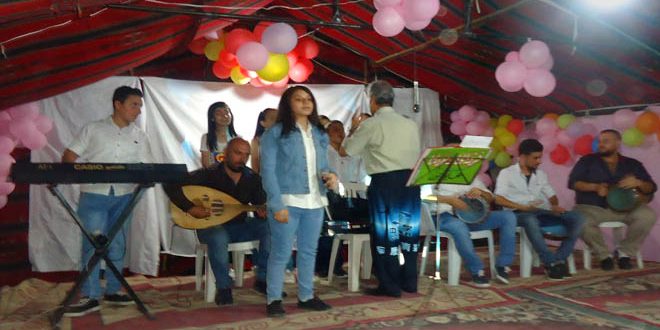 عرض أطفال مواهبهم في الغناء والعزف والتمثيل خلال حفل فني منوع أقيم ضمن فعاليات مهرجان اليراع الثقافي الأول في حديقة رواد البيئة بمدينة جرمانا.