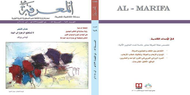 حفل العدد الجديد من مجلة المعرفة الثقافية الشهرية الصادرة عن وزارة الثقافة بعدد من الدراسات والبحوث في الأدب والثقافة إضافة إلى كتاب المعرفة الشهري الذي احتوى قصة مترجمة للكاتب الأمريكي توماس وولف بعنوان “لا تستطيع الرجوع إلى البيت”.