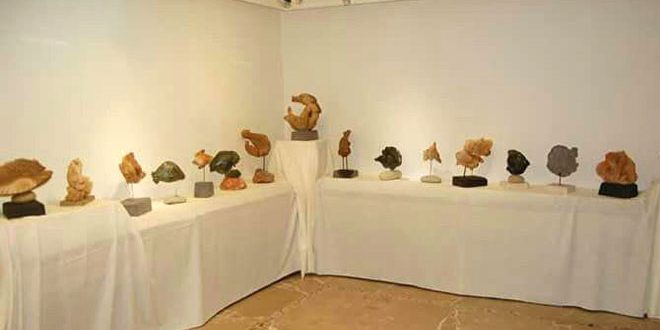 يضم معرض الفنان التشكيلي زهير خليفة المقام في صالة عامر للفنون الجميلة بمدينة جبلة تحت عنوان مئة وسمكة اكثر من 100 منحوتة حجرية عن الأسماك وحياة البحر.