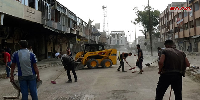 تواصل الورشات الفنية في مجلس مدينة درعا بالتعاون مع دائرة العلاقات المسكونية والتنمية ومديريتي الخدمات الفنية والزراعة أعمال إعادة تأهيل شارع الشهداء أحد أبرز الأسواق التجارية في وسط مدينة درعا لإزالة آثار الاعتداءات الإرهابية التي طالت هذا الشارع تمهيدا لعودة أصحاب المحال التجارية إليه خلال الأيام القادمة.